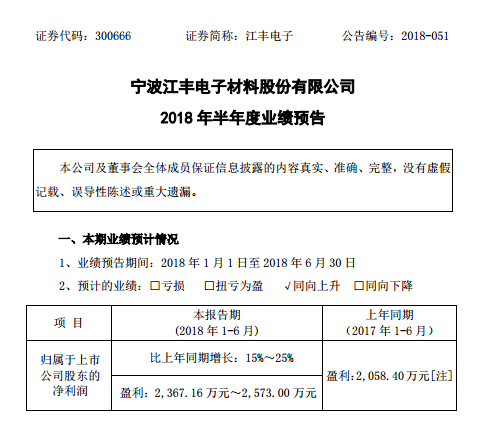 7月13日,江丰电子发布《2018年半年度业绩预告》,显示预计上半年,公司实现归属于上市公司股东的净利润为2367.16万元—2573.00万元,比上年同期增长15%—25%。