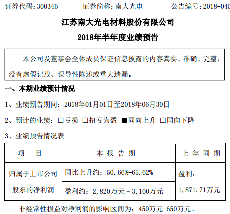 7月3日,南大光电发布《2018年半年度业绩预告》,显示预计上半年,公司实现归属于上市公司股东的净利润为2820万元—3100万元,同比上升约50.66%—65.62%。
