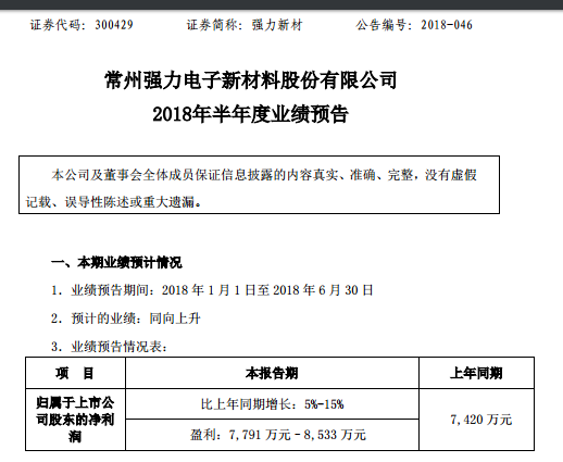 7月12日,强力新材发布《2018年半年度业绩预告》,显示预计上半年,公司实现归属于上市公司股东的净利润为7791万元—8533万元,比上年同期增长5%—15%。