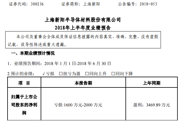 7月12日,上海新阳发布《2018年上半年度业绩预告》,显示预计上半年,公司实现归属于上市公司股东的净利润亏损1600万元—2000万元,上年同期盈利3469.89万元。