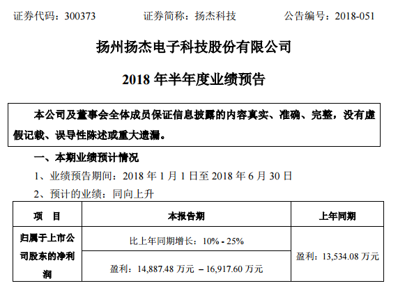 7月13日,杨杰科技发布《2018年半年度业绩预告》,显示预计上半年,公司实现归属于上市公司股东的净利润为14887.48万元—16917.60万元。比上年同期增长10%—25%。