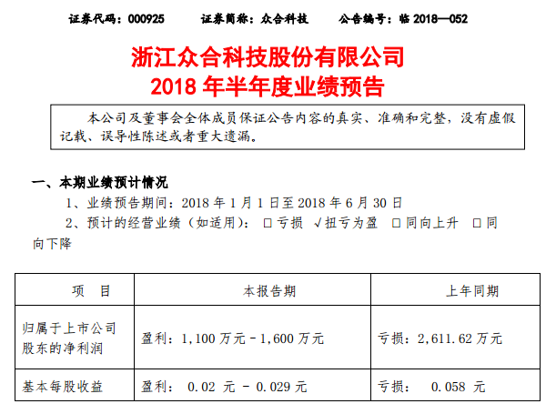7月14日,众合科技发布《2018年半年度业绩业绩预告》,显示预计上半年,实现公司归属于上市公司股东的净利润为1100万元—1600万元,上年同期亏损2611.62万元。