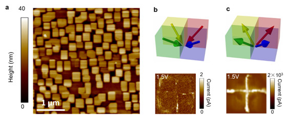 图1:(a)大面积自组装BiFeO3纳米岛;(b)“头-头”相对铁电畴壁具有低的电导;(c)“尾-尾”相对铁电畴壁具有高的电导。电场调控高低电导相差3个数量级。