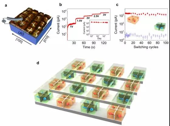 图2:(a)对自组装岛畴壁的大面积探测和调控;(b)畴壁高电导的稳定性;(c)拓扑受限畴壁高低电导的可调控性;(d)基于可调控拓扑受限畴壁电导的原型器件设计。