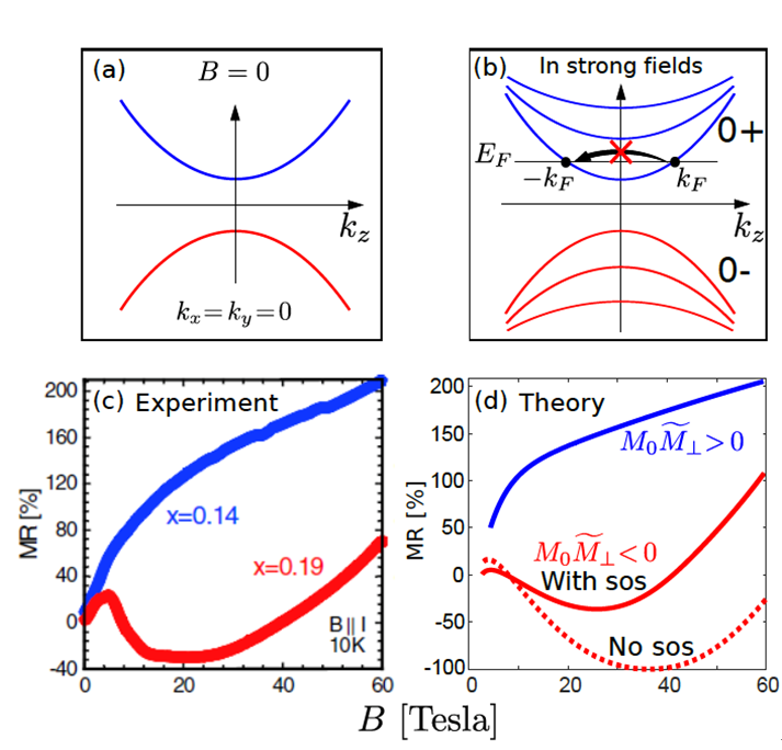 本文的突破便在于验证了最新的实验结果。作者从一个具有一般性的描述拓扑绝缘体中体态电子的模型出发,通过计算量子极限下材料电阻的方法揭示了在磁场平行于材料电流时,拓扑绝缘体中的体态电子在量子极限的某个特定磁场强度下,背散射的过程将被禁止,从而导致其输运时间发散,对应电阻会有一个极小值,而拓扑平庸的绝缘体中则不会发生这种现象。利用拓扑绝缘体的这个特点,只需要给实验材料通上平行于电流的强磁场并且测量其电阻即可辨别它是否是拓扑绝缘体,而不需要角分辨光电子能谱和隧道扫描显微镜等大型昂贵仪器的参与。这个理论与最新的实验结果吻合很好 [图一(c)和(d)]。