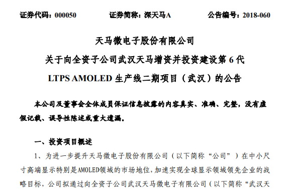 7月27日消息,深天马A(000050.SZ)发布公告表示,公司拟通过向全资子公司武汉天马增资的方式在武汉天马第6代LTPSAMOLED项目基础上进行投资扩产,扩大第6代LTPSAMOLED生产线产能规模,即投资建设第6代LTPSAMOLED生产线二期项目(武汉)(以下简称“二期项目”),二期项目投资总金额约145亿元人民币。