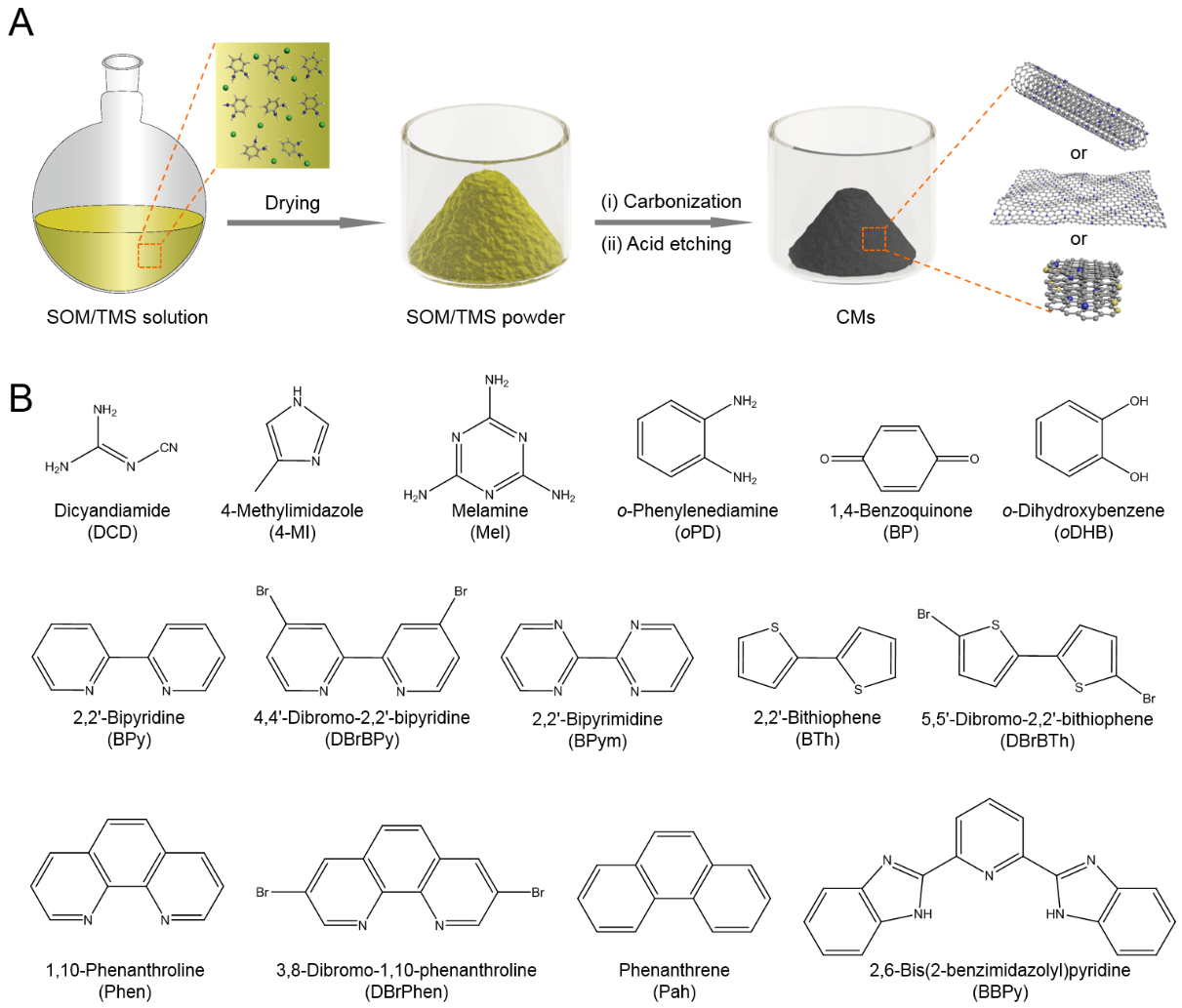 ( A )过渡金属辅助碳化有机分子制备碳纳米材料的示意图;( B )该方法所使用的有机小分子前驱物的结构