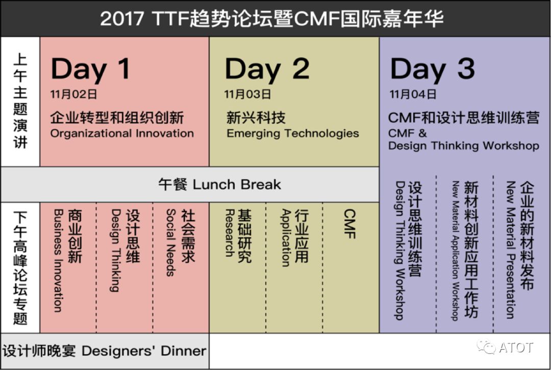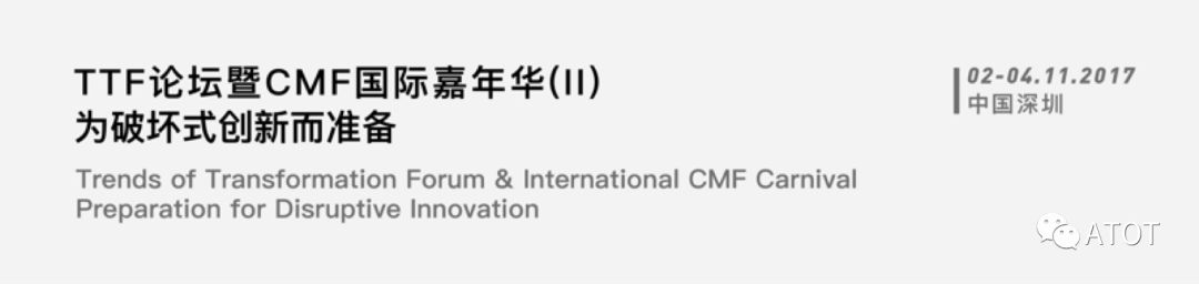 2017年11月,以“为破坏式创新而准备”为主题的第二届TTF论坛在中国深圳举办,大会围绕组织创新、新兴科技转化、CMF发展趋势等主题,邀请了不同行业、不同领域的专家,探讨从国家政策、社会、经济、技术等方面宏观阐述企业组织或管理模式创新的必要性;通过介绍信息、材料、环境、能源和医疗领域的前沿科技成果,为企业战略转型或创业提供新的战略思路和技术路线理论依据;论坛同时发布了CMF领域最近行业趋势,并举办了来自全球200多家材料厂商的“世界新材料新技术展”。