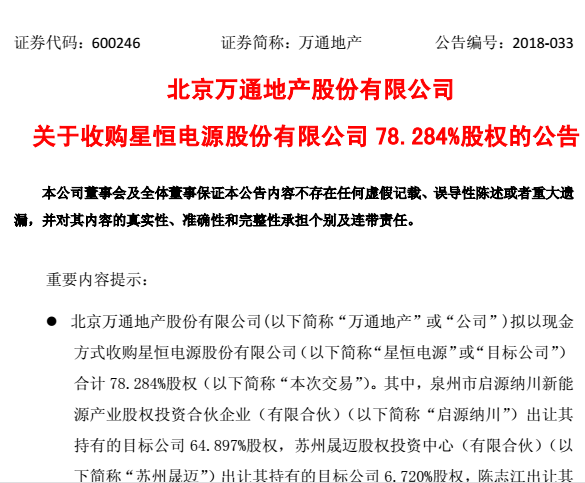 7月30日,万通地产(600246.SZ)发布公告,表示公司将拟以现金方式收购星恒电源股份有限公司合计78.284%股权,交易总价款为人民币31.7 亿元左右。其中,启源纳川出让其持有的目标公司64.897%股权,苏州晟迈出让其持有的目标公司6.720%股权,陈志江出让其持有的目标公司6.667%股权。