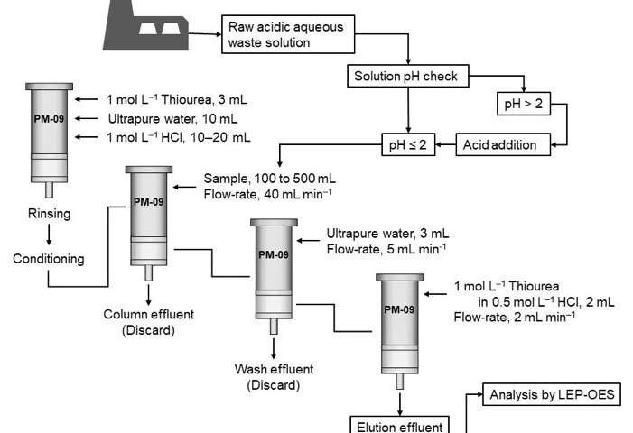液体电极等离子体—光发射光谱法(LEP-OES)是一种实现水基元素现场分析的工具。它比传统方法操作起来更为轻便,且成本更低。然而,如果贵金属浓度过低(比如废液中的贵金属),利用该方法进行现场分析时,其敏感度不足以进行精确的分析。问题之一在于冶金废料的渗滤液中,存在若干离子的干扰。这种情况下,分析物的分离和富集步骤(即去除其他物质并增加分析物浓度以使检测更为便捷)必须包括在对样品的分析中,以便实现贵金属的精确检测。