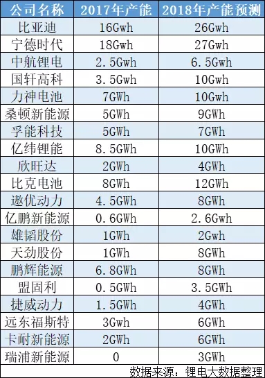 为此,锂电大数据整理了宁德时代、比亚迪、欣旺达、孚能、力神、万向A123、猛狮科技、微宏动力、桑顿新能源、天劲股份、遨优动力、鹏辉能源、亿鹏新能源、迪比科、瑞浦新能源等25家动力电池企业2017年产能(20家见表格,5家表格外),及2018年的产能预测和未来规划,仅供行业参考。