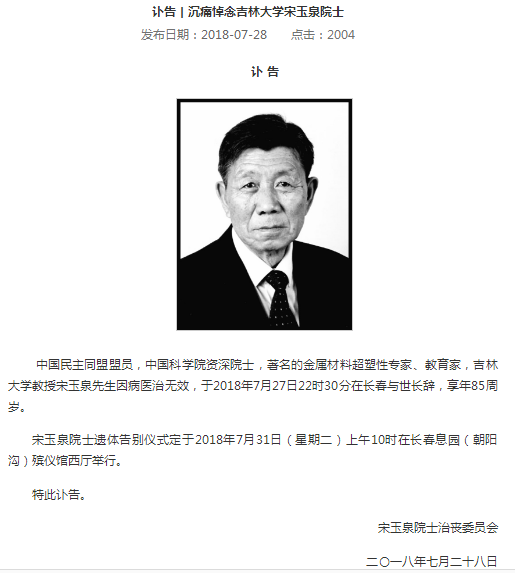 7月28日,吉林大学官网发布讣告,中国民主同盟盟员,中国科学院资深院士,著名的金属材料超塑性专家、教育家,吉林大学教授宋玉泉先生因病医治无效,于2018年7月27日22时30分在长春与世长辞,享年85周岁。