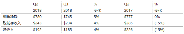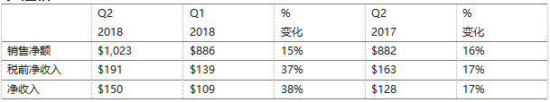 “在第二季度,我们各项业务的业绩均达到或超出预期水平。我们现在预计公司2018年的发展势头会比之前预期的更为强劲,全年销售额将提高10%达到约113亿美元,2018年下半年的利润也将增长,”高级副总裁兼首席财务官Tony Tripeny说道。