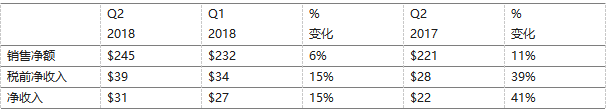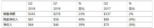 光通信业务在2018年第二季度的销售净额超过10亿美元,增长16%。净收入同比增长17%。数据中心和运营商业务带动了销售额的增长。