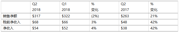 环境科技业务在2018年第二季度的销售净额同比增长21%,达到3.17亿美元,净收入同比增长42%,达到5400万美元。各项产品均带动增长。