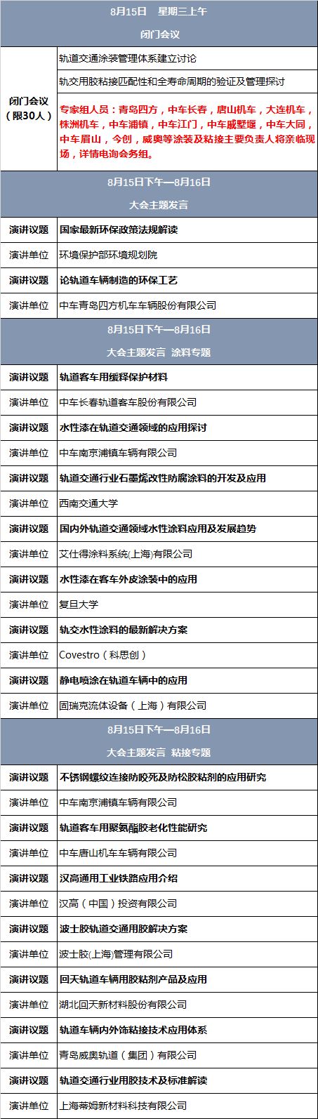 尊敬的代表,您好!十分荣幸由我邀请您参与2018轨道交通装备用胶及涂装工艺创新发展论坛,本届峰会将于8月15-16日在中国·上海隆重召开。本次会议旨在提升我国轨道交通行业的涂装和胶粘剂技术水平,推进涂装胶粘新工艺、新材料及优质装备在轨道交通中的应用,帮助企业解决轨道交通行业涂装和胶粘工艺技术供求对接不畅及新材料应用方面的难题。