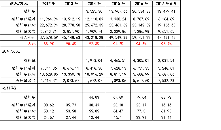 公司碳纤维的主要产品是GQ3522,即T300级别产品,2016年产能176吨,销量141吨(包括自用85吨,外销56吨)。,2017年1-6月碳纤维销量达到153吨。此外,公司还会对外采购碳纤维作为织物和预浸料的原材料,采购量是自产量的3倍左右。