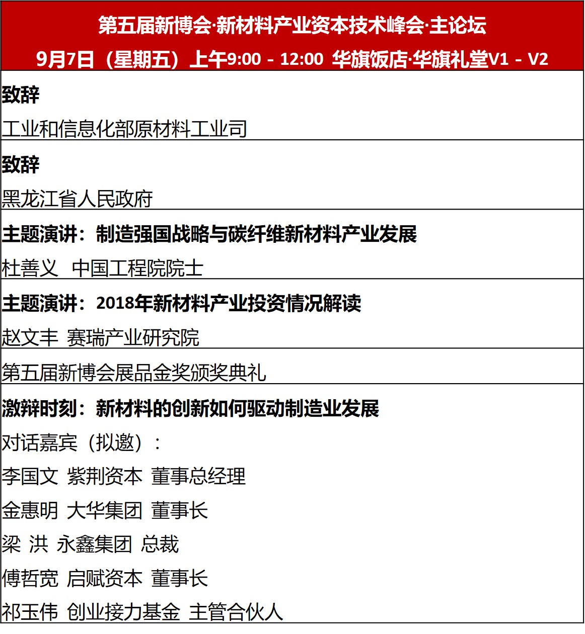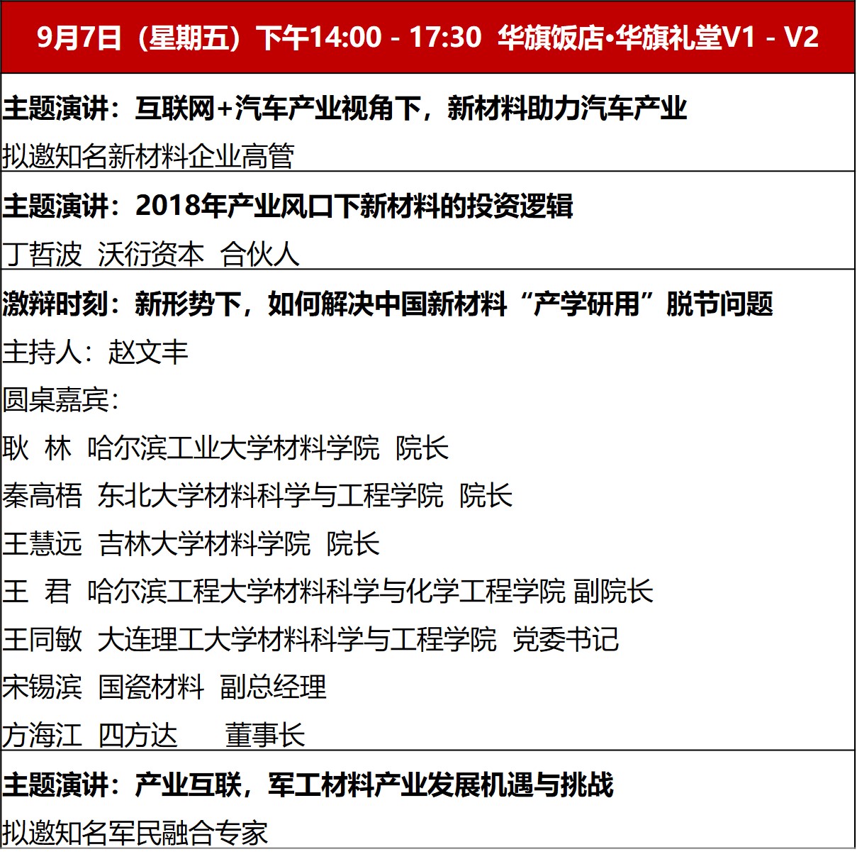 会议受众:新材料产业相关政府领导、院士专家、材料院长、企业高管、投资大咖、行业菁英、金融机构负责人、媒体代表等