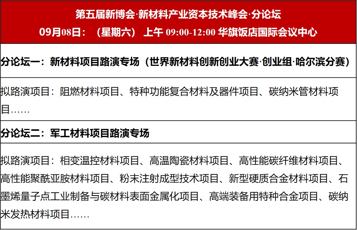 由工业和信息化部与黑龙江省人民政府共同主办的中国国际新材料产业博览会(以下简称新博会)已分别于2011、2012、2014、2016年在哈尔滨市成功举办四届。2011年,时任国务院副总理张德江出席首届新博会并宣布开幕。2014年,新博会在国务院备案,成为国家清理和规范庆典研讨会论坛工作领导小组批复展会。2016年,工业和信息化部、发展改革委、科技部、财政部联合印发《新材料产业发展指南》,将定期举办新博会作为引导国家新材料产业健康有序发展的保障措施。目前,新博会已经成为全国唯一由政府主办的新材料产业界规格较高、规模较大、政策信息权威、产业氛围高度集聚的博览会。
