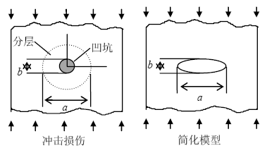 b) 按图6所示的原则将冲击损伤简化为椭圆孔,其长轴等于分层区投影图的宽度,分层区投影图可由无损检测给出或用上节所述的方法计算得到;其短轴等于表面凹坑的宽度,表面凹坑的宽度可以直接测出或简单假设为长轴的0.3;