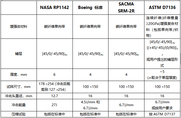 从1990年代起CAI的试验方法就已列入ASTM D30委员会制定新标准的计划,但由于对CAI的认识在业内人士中并不统一,因此将SACMA标准升级为ASTM标准的工作迟迟没有进展。直至2007年冲击后压缩的试验标准才正式以D7136,“测量纤维增强聚合物基复合材料对落锤冲击事件损伤阻抗的标准试验方法”和D7137“含损伤聚合物基复合材料板压缩剩余强度性能的标准试验方法”升级进入ASTM标准行列。在D7136的范围中指出:“当受到冲击的试样按试验方法D7137/D7137M进行试验时,通常将整个试验顺序称为冲击后压缩(CAI)方法。”与原来标准相比,除保留原来的试验用途外,增加了下述用途:“某些试验机构可能希望将本试验方法与D7137/D7137M一起使用,来评定含规定损伤状态(如规定的凹坑深度、损伤尺寸等)试样的压缩剩余强度。”得到的性能“能为得到用类似材料、厚度、铺层顺序等制造的复合材料结构预期的损伤容限能力提供指南。”之所以在标准中增加这部分内容,是因为6.7J/mm的冲击能量产生的损伤程度(凹坑深度)与飞机结构损伤容限设计要求中对初始损伤尺寸的定义(目视勉强可见——BVID)不一定一致(有关内容将在另文中说明)。把标准一分为二的原因还有一个考虑,即一旦得到更充分的研究后有可能使用更方便的静压痕方式引入损伤。CAI试验标准的演变见表1。