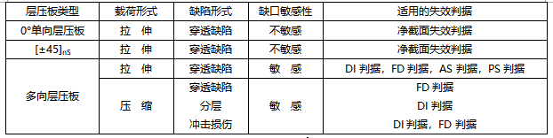 层压板的铺层形式不同时其缺口敏感性不同,所用的失效判据也不同。表2列出了不同层压板的缺口敏感性和适用的失效判据。另外失效判据还同层压板的破坏模式有关,表中列出的判据主要适用于纤维控制破坏模式的层压板。