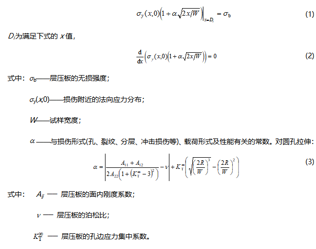 研究表明,随载荷增加,缺口附近会形成由分层和基体裂纹构成的损伤区,损伤区内的应力分布呈均匀化的趋势,同时降低了缺口引起的应力集中,因此所有含缺口层压板剩余强度的失效判据均含有反映这一现象的附加参数。