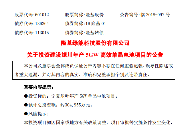8月3日,隆基股份(601012.SH)发布公告表示,公司拟在银川投资建设年产5GW高效单晶电池项目并作为公司2018年度配股公开发行证券募集资金投资项目实施,项目由公司全资子公司宁夏乐叶负责项目运营和管理。