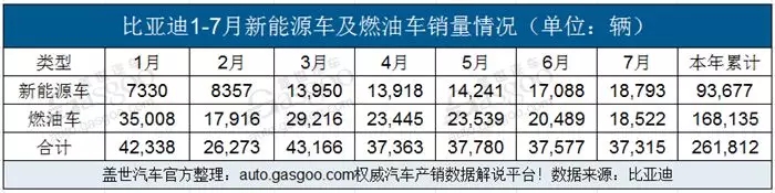 比亚迪今日发布2018年7月销量快报。数据显示,比亚迪7月共销售新车37,315辆,与前几月相比变化不大,本年累计销量达到261,812辆,较去年同期增长23%。其中,新能源车7月销量共计18,793辆,本年累计销量达到93,677辆;燃油车7月销量达为18,522辆,本年累计销量达到168,135辆。