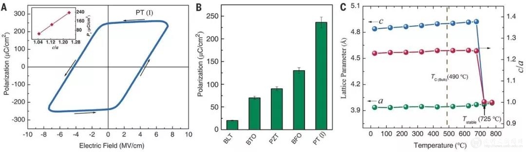 近期,北京科技大学邢献然教授团队提出一种可简单实现应变工程的新方法——“相界面应变”(Interphase Strain),在超四方薄膜中实现了巨大铁电性。研究成果以“Giant polarization in super-tetragonal thin films through interphase strain”(通过相界面应变制备巨大极化的超四方薄膜)为题,于2018年8月3日发表在美国《Science》。北京科技大学张林兴博士为第一作者,陈骏教授和邢献然教授为通讯作者。