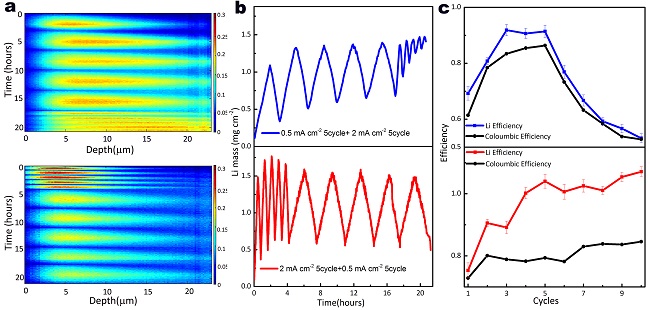 图2. 不同循环历史对Li总量的演变影响:a.原位NDP测量;b. 不同循环下监测得到的Li总量;c. 对应的库仑效率和锂沉积效率比较。