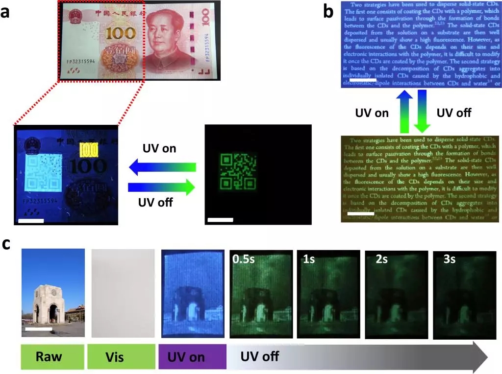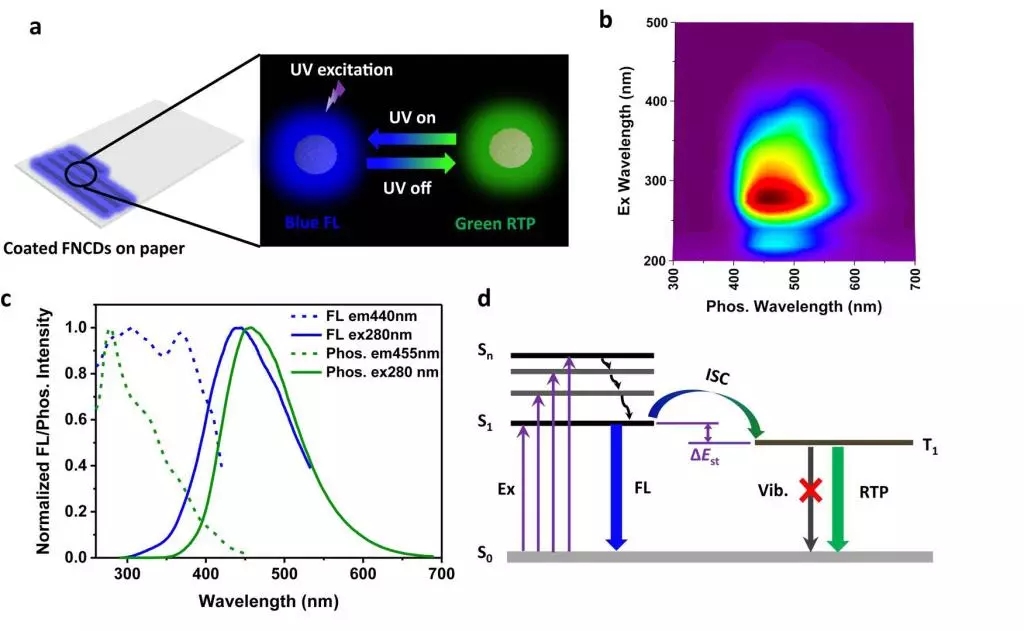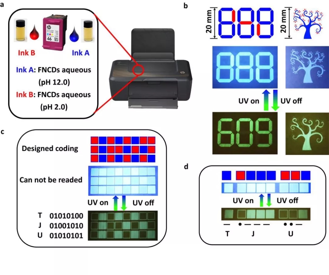 这种氟氮双掺杂碳量子点表现出优异的荧光 pH 稳定性和自保护室温磷光 pH 响应性,其室温磷光寿命在强碱性环境下达到 1.21 秒。用氟氮双掺杂碳量子点的水分散液制备的墨水可以通过商业喷墨打印机将设计的复杂图案、文字等加密信息打印在滤纸上,待其干燥后在紫外灯下发射出强烈的固态蓝色荧光,移去紫外灯后会发射出自保护绿色磷光。因此,基于氟氮双掺杂碳量子点隐形墨水可被应用于信息记录/读取、防伪和隐写术领域。同时,这种双元素共掺杂技术为室温磷光材料的设计和应用提供了新思路。