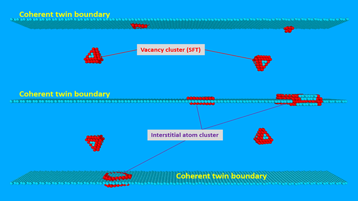 为了揭示这一新颖且重要的现象,东京大学材料建模实验室的研究人员进行了长时间的分子动力学模拟来研究孪晶边界和一些典型的辐射诱发点缺陷之间的动态相互作用。