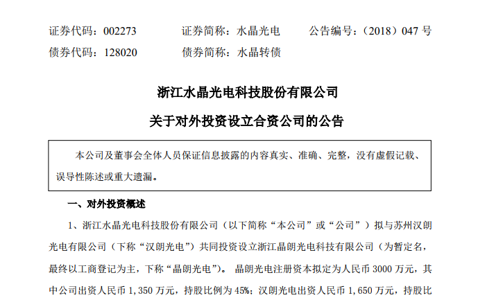 8月8日,水晶光电(002273.SZ)发布公告表示,拟与汉朗光电共同投资设立浙江晶朗光电科技有限公司(暂定名,最终以工商登记为主,下称“晶朗光电”)。晶朗光电注册资本拟定为人民币3000万元,其中公司出资人民币1,350万元,持股比例为45%;汉朗光电出资人民币1,650万元,持股比例为55%。