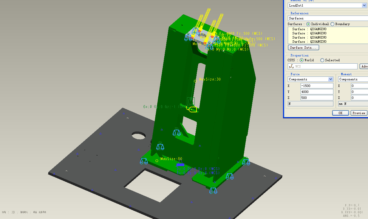 垂直方向重力3000N,由后向前的力1500N(因为滑台至于箱体前面会对箱体产生偏心受压受拉),侧向偏载500N(有可能底面不平略有倾斜)。底部6个螺栓每个螺栓施加预紧力7400N、顶部螺栓预紧力4600N。箱体材质均为Q235A,焊缝强度不低于Q235A母材强度。为了简化分析,将焊缝视为与母材同样的强度、将螺栓视为高强度螺栓材质。