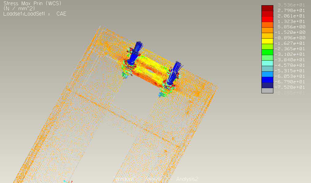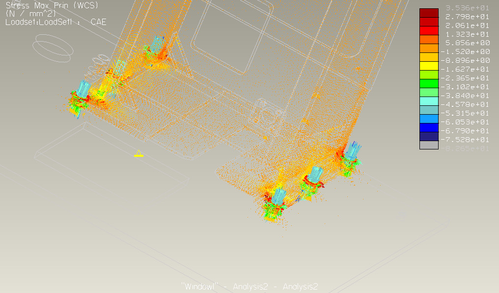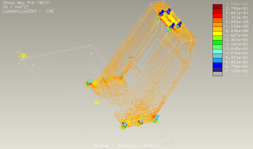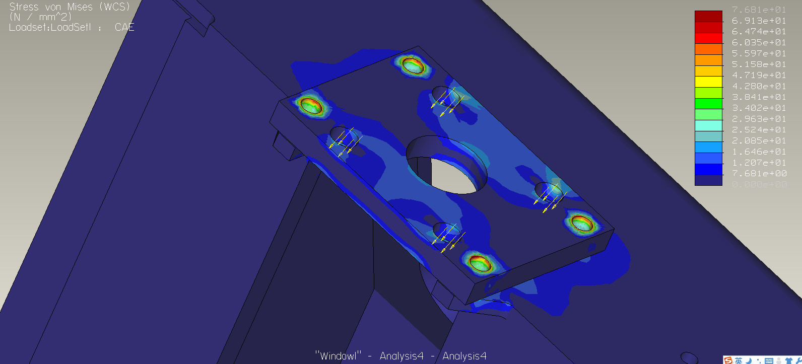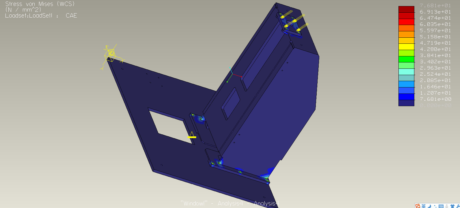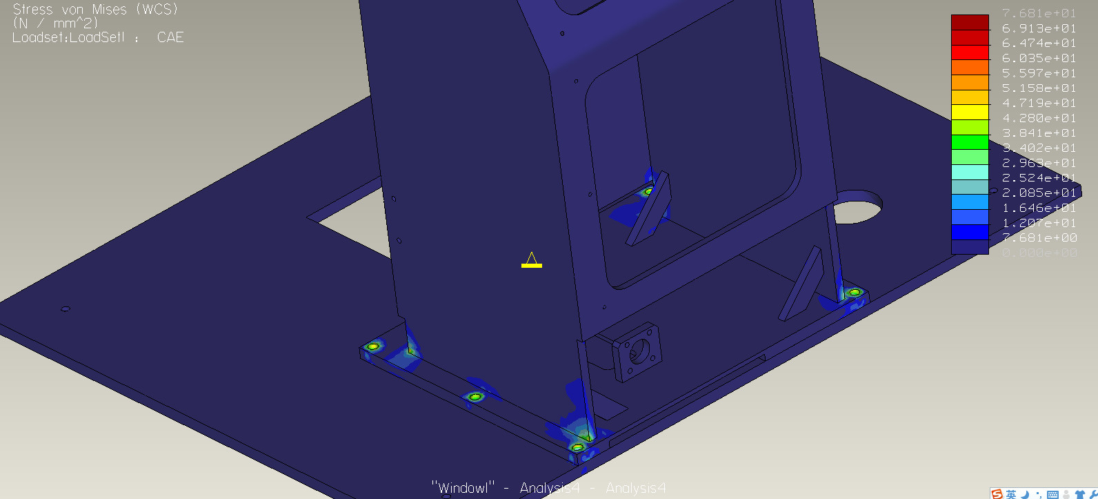 综上所述此次箱体设计安全系数为3.0左右(最大应力78.6Mpa)。(最大应力在气缸固定座靠近箱体左后侧方向上的螺栓连接处。)因此该设计完全能满足实际生产使用要求。事实证明在低碳钢材质、静载负荷下本优化设计方法简便有效(proe自带的mechia)。以前本人也做过ANSYS与proe自带的mechia模块的对比,在静力学分析上两者相差无几。只有显示动力学、非线性力学、大变形、多物理场耦合才适合用ANSYS。毕竟用proe自带的mechia可以很好的与设计模型结合,也更利于通过系列函数设置边界条件从而在分析时联动。