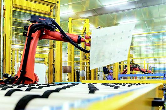 7月31日,全自动化机械臂正在分拣抓取下线的超薄电子玻璃。宜昌南玻光电公司已成为目前国内唯一一家能够量产0.2毫米超薄中铝电子玻璃的企业,打破了日美企业对此领域的垄断,产品技术指标已达到国际一流水平。2017年该公司产值达1.8亿元,上缴税收2000万元。