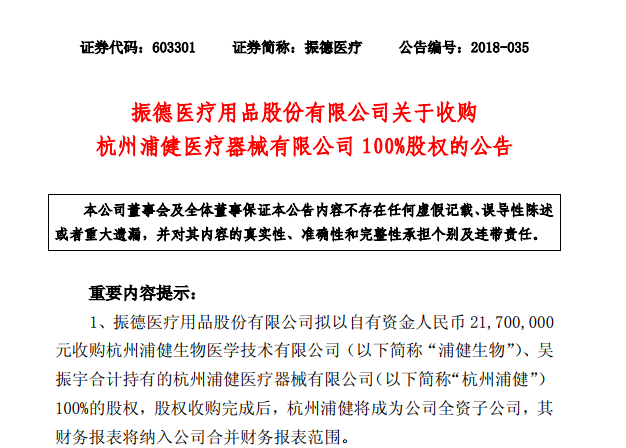 8月9日,振德医疗(603301.SH)发布公告表示,公司拟以自有资金人民币21,700,000元收购杭州浦健100%股权。