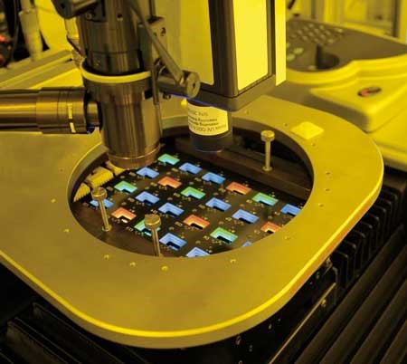 弗劳恩霍夫FEP研究所洁净室的探针台上有图案的有机发光二极管。图片来源:弗劳恩霍夫FEP研究所