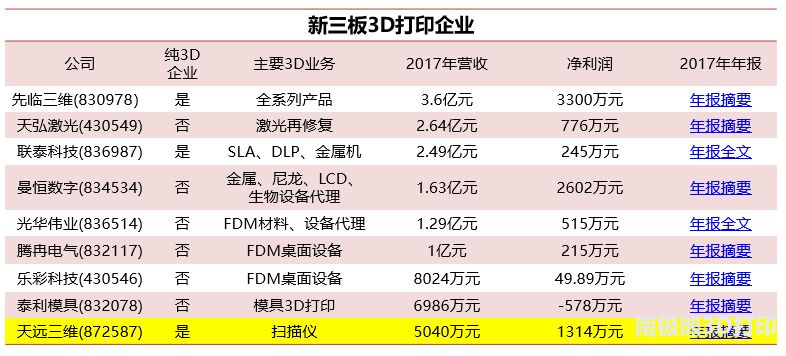其中标黄的两家公司(天远三维、极光三维)是2017年新挂牌的公司。