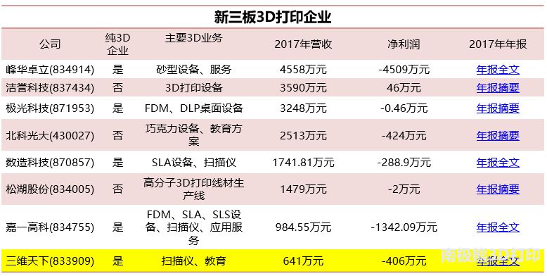 前两年,大量公司选择挂牌新三板,以拓宽自己的融资渠道,规范公司发展。同时,挂牌新三板的公司每年都需要公开自己的业绩情况,南极熊统计了17家挂牌新三板的3D打印公司在2017年的业绩情况。