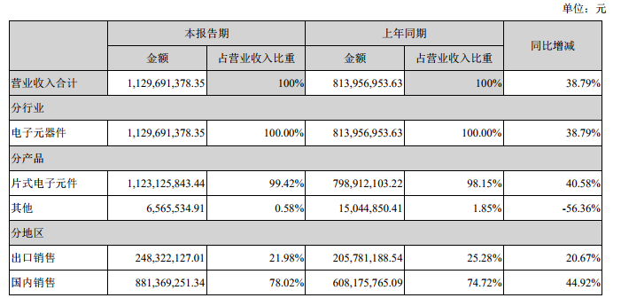 8月10日,顺络电子(002138.SZ)发布《2018年半年度报告》,显示公司2018年半年度公司实现营业收入11.30亿元,较上年同期增长38.79%;实现归属于上市公司股东的净利润2.26亿元,较 上年同期增长30.20%。公告显示,公司上半年片式电子元件收入为11.23亿元,占营业收入比重达99.42%,具体情况如下: