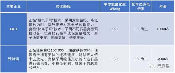 磷酸铁锂快充电池是在技术最为成熟的磷酸铁锂体系内进行优化和潜力挖掘,材料成本相对较低,再结合成熟的技术背景及稳定的产品性能,发展潜力巨大。代表企业有宁德时代(CATL)和沃特玛等。
