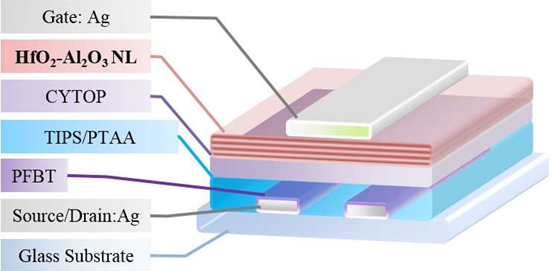晶体管包括三个电极。源极和漏极通过电流以产生“on”状态,但只有当电压施加到栅电极上时,就会通过薄介电层与有机半导体材料分离。佐治亚理工学院开发的结构具有一个独特方面,那就是它的介电层使用两个组分,一个含氟聚合物和一个金属氧化物层。