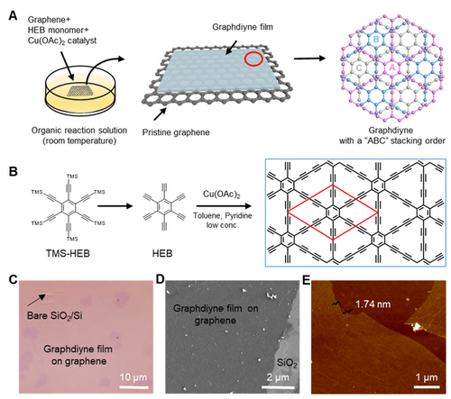 图一:石墨烯上少层石墨双炔薄膜的合成过程及相应的表征结果,薄膜厚度为1.74 nm(包含单层石墨烯的厚度)