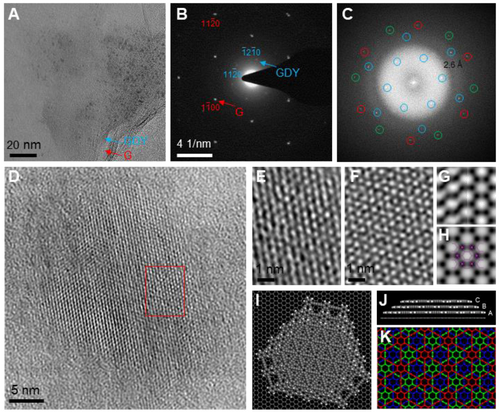 图二:石墨烯上少层石墨双炔薄膜的高分辨透射电镜表征结果,结合理论模拟,确认了该石墨双炔薄膜为ABC堆垛的三层结构