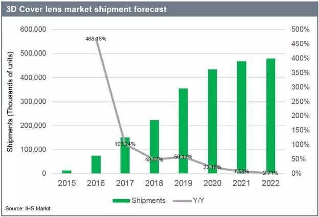 根据IHS Markit的《触控面板盖板玻璃市场报告》,未来几年的增长将保持强劲,在2019年和2020年的增长幅度将分别达到59.1%和22.2% Y/Y。