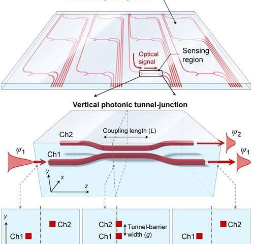 说明:压力传感器由一系列彼此平行(顶部)的波导组成。当波导之间的间隙变窄时,来自第一通道的光就可以跳入第二通道(底部)。 通道更高的压力使间隙变得更窄,允许更多的光线从通道1移出并进入通道2.图片来源:Suntak Park,韩国大田电子电信研究所