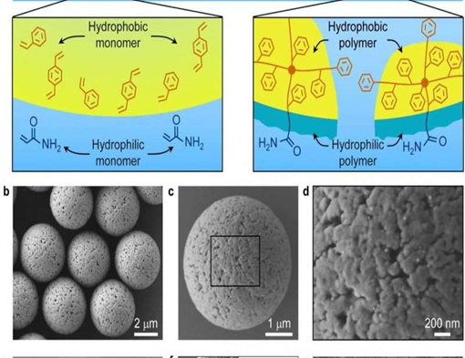 图为利用表面聚合法形成的具有亲水 - 疏水纳米孔柱列阵异质结构的颗粒。图片来源:SONG Yongyang博士
