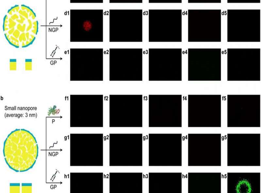 图为具有纳米孔柱列阵异质结构的颗粒对溶剂转换生物分子的吸附作用。图片来源:SONG Yongyang博士